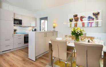 Auch an die Kinder ist gedacht: Sie finden einen Kinderhochstuhl, ein Babybett und Kindergeschirr in der Wohnung vor. In naher Umgebung zur Wohnung gibt es ebenfalls einige Spielmöglichkeiten für die Kleinen. Sei es die Erlebnisseebrücke direkt am Strand, der Kletterspielplatz im Yachthafen – oder bei schlechtem Wetter das Aktiv-Hus im Ferienpark.